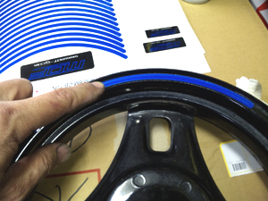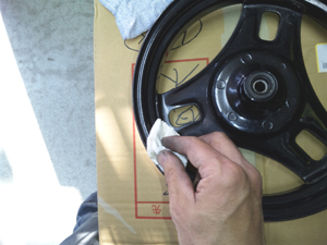 油分があると貼った後はがれやすくなるので、ホイールを洗ったらティッシュにパーツクリーナーをつけ、貼り付け部分をしっかり脱脂しましょう。