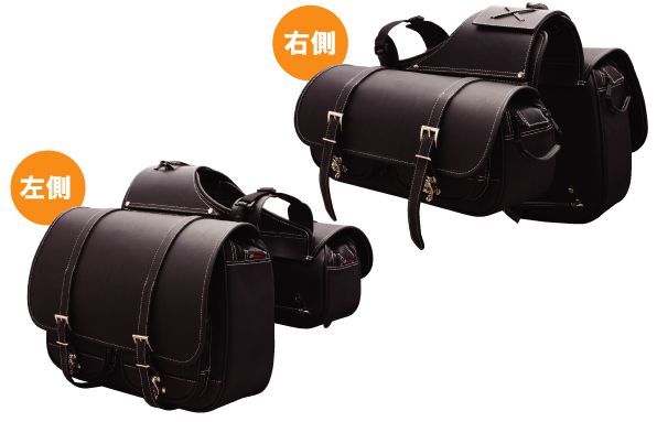 このサドルバックはご覧のように右側のバックの高さが低くて、右出しマフラーのアメリカンでも取り付け出来るんです。